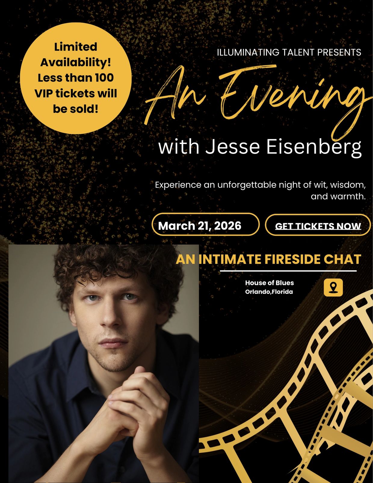 The purchase of a VIP pass to this event will include memorable moments, intimate interactions, including photos with the guest of honor, front row seating and more! Your evening begins with an exclusive cocktail hour with an open bar and passed Hors' d' oeuvres. During the cocktail hour, you will be escorted in for your opportunity for a meet & greet with Jesse Eisenberg, followed by a professional photo op.